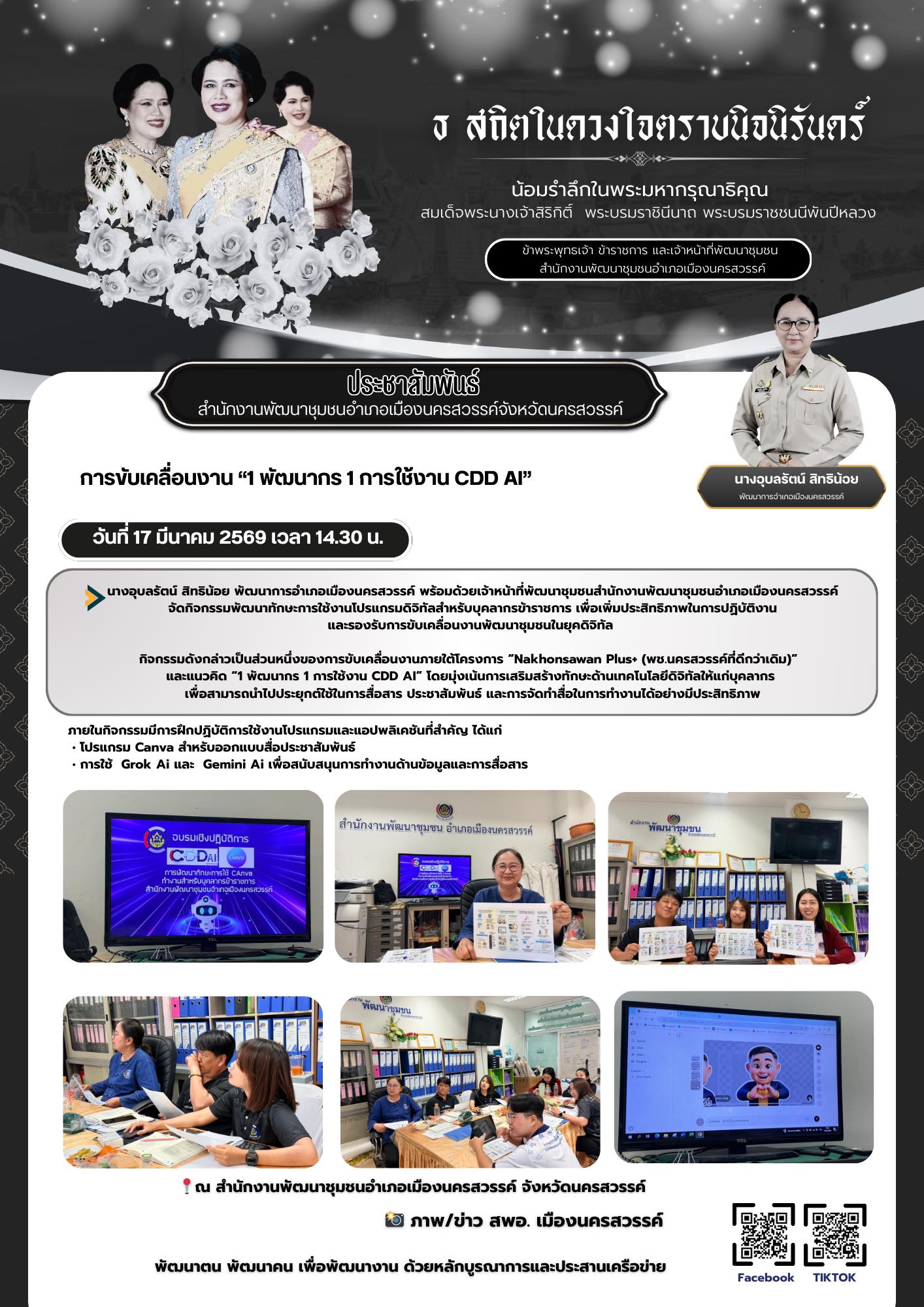 กิจกรรมดังกล่าวเป็นส่วนหนึ่งของการขับเคลื่อนงานภายใต้โครงการ “Nakhonsawan Plus+ (พช.นครสวรรค์ที่ดีกว่าเดิม)” และแนวคิด “1 พัฒนากร 1 การใช้งาน CDD AI” โดยมุ่งเน้นการเสริมสร้างทักษะด้านเทคโนโลยีดิจิทัลให้แก่บุคลากร เพื่อสามารถนำไปประยุกต์ใช้ในการสื่อสาร ประชาสัมพันธ์ และการจัดทำสื่อในการทำงานได้อย่างมีประสิทธิภาพ